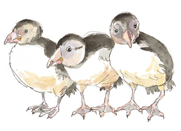 Opening:  “It is the end of August.  Soon the adult puffins will be gone to spend the winter in the cold northern seas.  The pufflings in the dark burrows will then be on their own.”