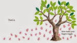 Why I Like This Book:  Who needs an app for interactivity?  This book has it all.  Tap the tree to make the leaves come out.  Rub the tree to make it warm so it blossoms.  Jiggle the tree and wiggle your fingers to make a rain of petals.  Brush the petals away and blow the tree a kiss to make apples form.  The reader is in charge and gets to do all the activities.  So clever and fun!