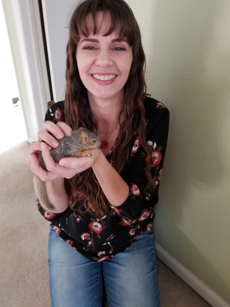 This is me with Daffodil, a baby squirrel we found right before a blizzard in April 2020. My daughter and I fed him every 2 hours and released him in our back yard in July. He still visits us.