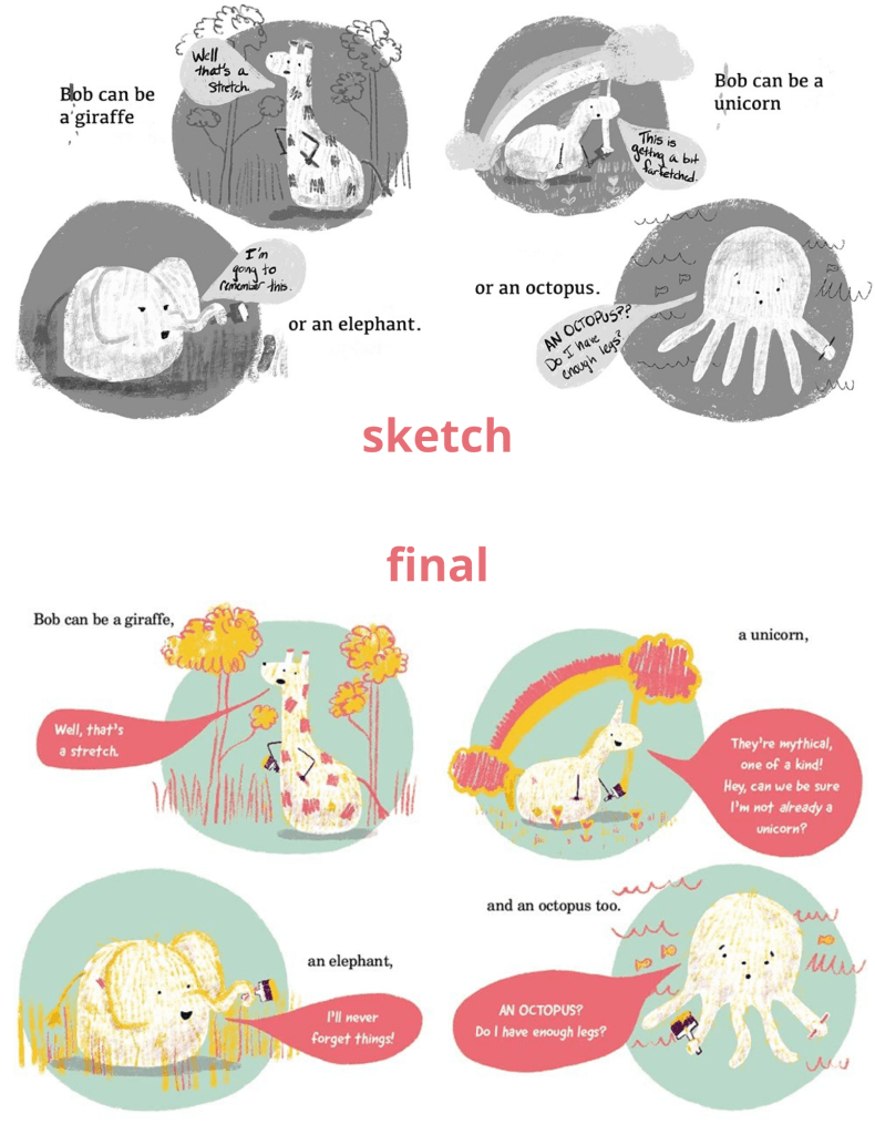 ANNE: I worked with my agent to tweak the draft until the ending felt satisfying, which involved both text and art revisions. Usually, I go through a couple round of edits with my critique groups, then send to my agent. Once my agent gives me feedback, I don’t show it to my critique group again unless it needs a major rewrite. For Blob, I skipped the critique group step, because I felt that it was already in a good place and we already had a request from a publisher to see it.