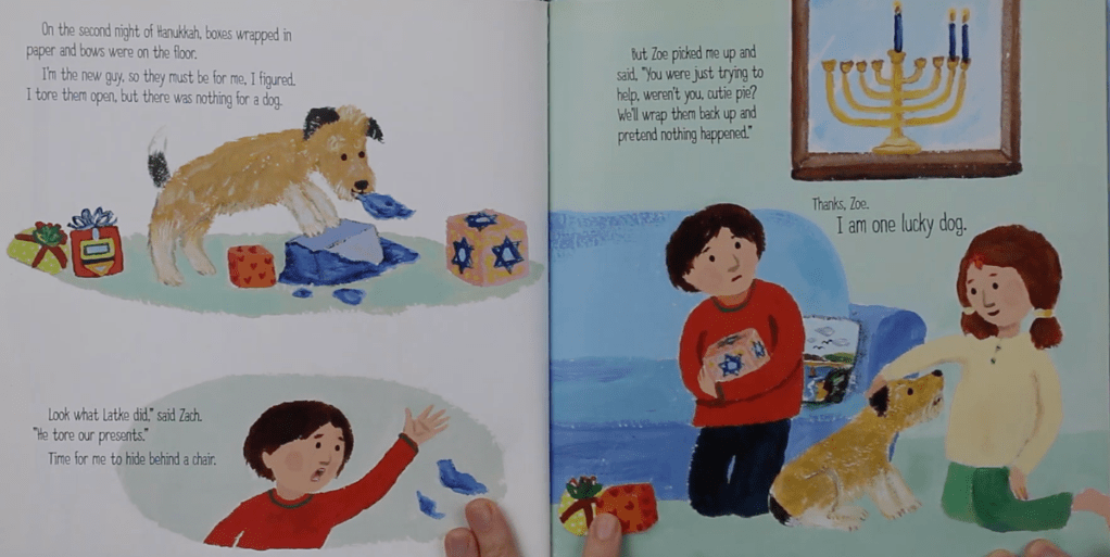 Opening: “I am one lucky dog. Imagine a mutt like me, picked as a Hanukkah present. It happened one day in December when a family walked into the shelter. A mom, a dad, and two kids – Zoe and Zach.”