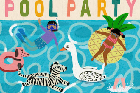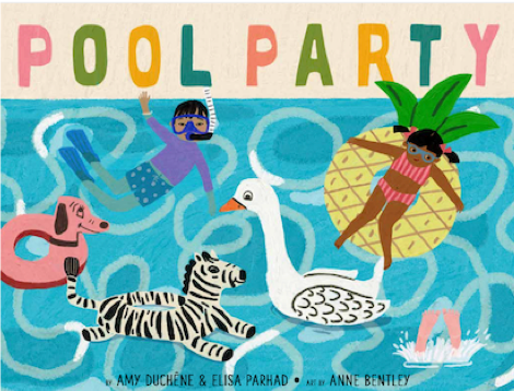AMY: Elisa and I met in a swimming pool at roughly age 3 and have been friends ever since. We swam together on a club relay team that broke a city record (Seattle Summer Swim League shout out!). We’re also both writers and have been in a kidlit writing group together for over half of a decade here in Los Angeles. We had talked for a while about co-writing something and had never quite landed on a story or topic. And then, one day in summer 2018, a fun rhyming couplet came to my mind: “jump, hop, bellyflop” along with the proposed (and now real) title “POOL PARTY.” I think I emailed Elisa at that exact moment and plead her to consider co-writing a story with me about summertime fun in the pool.