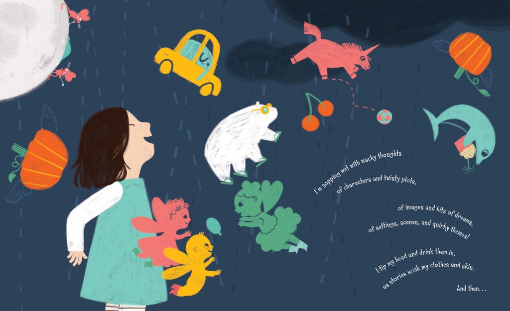 REBECCA: As I said, BRAINSTORM! began as a poem. A pretty short poem– Just six couplets. I really thought that’s all it would be. It sat on my computer for a couple of months, but it kept calling to me, so I began tinkering. I wondered: what if it wasn’t just IDEAS that fell from the sky, but WORDS, like VERBS and NOUNS, and PHRASES and SENTENCES and CHARACTERS and PLOTS…. Suddenly, I found myself deluged in this amazing world where stories drizzled down and swirled all around us. I loved watching my MC play in the puddles! In the end, I saved 15 drafts of this story, so it definitely changed and grew over the months, but those initial six couplets (with some minor tweaks) are all still in the final version.
