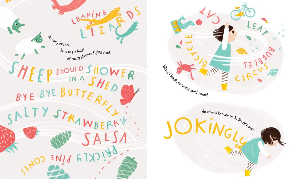 REBECCA: I was thrilled when I heard that Kate Kronreif would be illustrating! I was sent initial character sketches for review and my editor, Sarah, and I had a Zoom call to discuss the initial black and white sketches, as well as the color sketches once they were available. Sarah asked for my feedback on the cover as well. I felt very included in the process and that my opinion mattered, and Sarah was always open and willing to answer all my questions along the way. Now that I see the final product, I realize how difficult this story must’ve been to illustrate! I mean, how does someone illustrate “An easy breeze becomes a blast/of funny phrases flying past?” Thank goodness both Sarah and Kate totally understood my vision and took it to the next level!