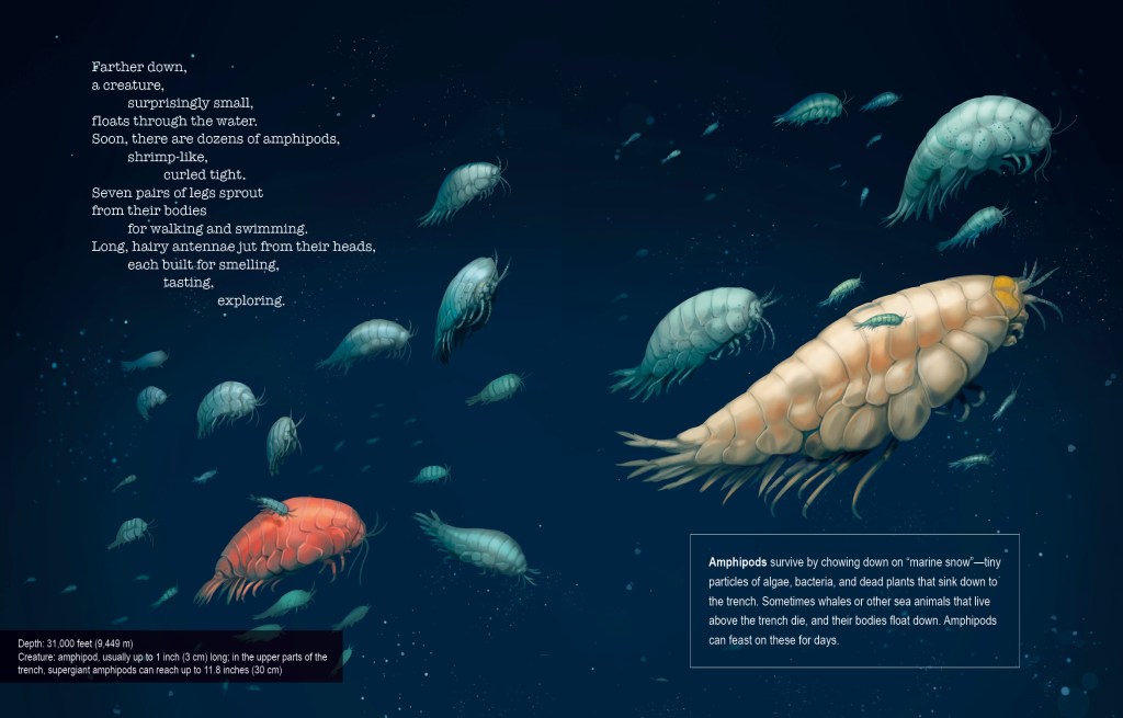 My goal in writing this book was twofold: firstly, to educate children on the deepest ocean of our world and debunk the myth that “scary” creatures live within its depths, and secondly, to talk about ocean conservation and the importance of this fascinating ecosystem. The text of the narrative itself is layered. Younger students can focus on the main text while older students can also read the sidebars and detailed backmatter to have a more in depth understanding of the Mariana Trench and its inhabitants.