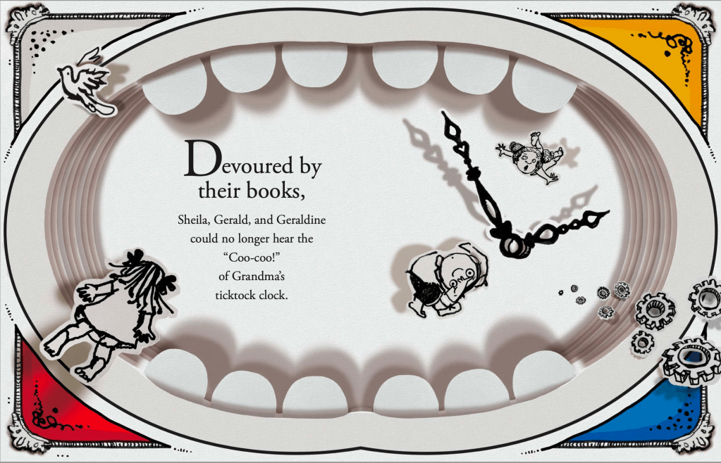 Brief Synopsis: One by one, cousins Sheila, Gerald, and Geraldine Grunion are eaten . . . by their books! And the experience changes their them for the good (except for Geraldine who is simply terrible 😊)