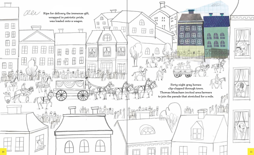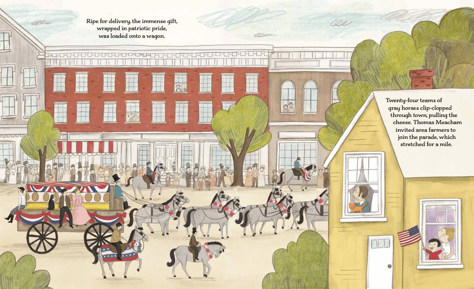 CATHY: If you keep your eyes and ears open, ideas are everywhere. I overheard the word “cheese” mentioned on a program my husband was watching. Cheese happens to be one of my favorite foods. In seconds, I was by my husband’s side watching the history channel. I learned about a 1400-pound cheese that was presented to the president of the United States. My first thought was, Who does that? My curiosity was piqued. After checking to see if anyone had written a picture book about this cheesy tale and finding none, I began my research.