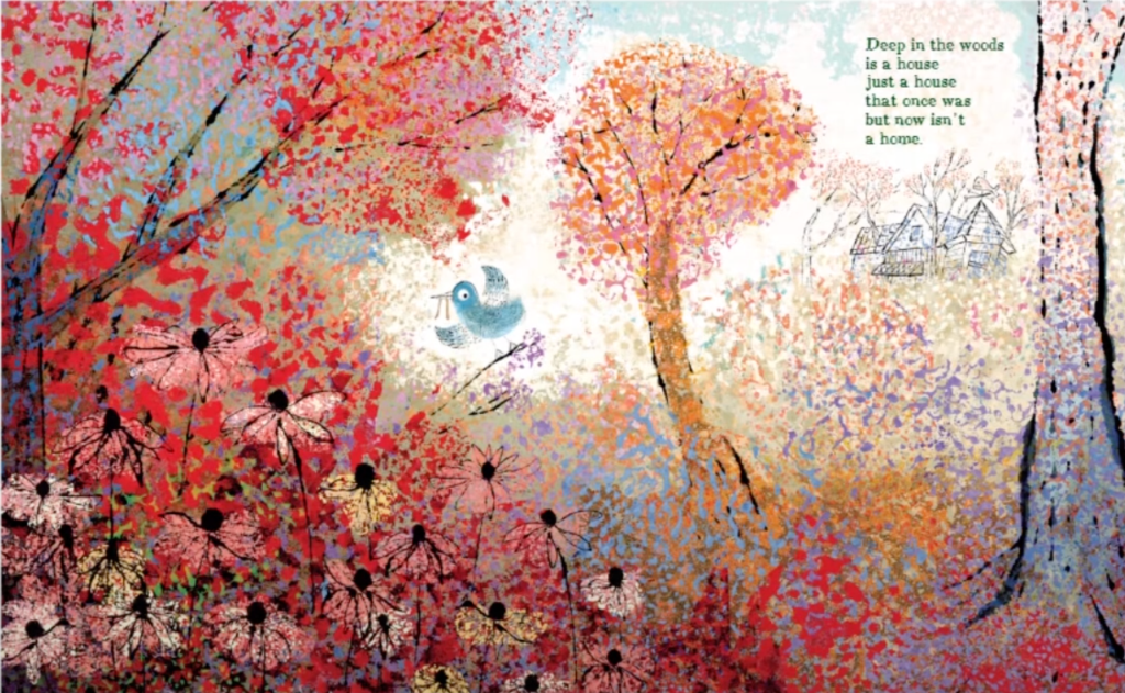 Why I Like This Book: This is such a wonderfully unusual story! Two children, wandering through the woods, come upon an abandoned house and wonder about its occupants. Who were they? Where did they go? Will the come back? And what about the house? Is it lonely, or does it like the way time has changed it? This is not at all a haunted house story, but a story which is a flight of imagination and an exploration of the concept of what makes a house a home. But the thing I like best about it is the read-aloud rhythm. The language just rocks and rolls – not in the Rolling Stones/Aerosmith/Queen kind of way π, but like waves rock a boat and lift it on the swells kind of way. Go back to the opening stanza and read it out loud to yourself just for fun. Isn’t it great? As a reader, or a listener, you can appreciate what a pleasure it is to read aloud. As a writer, you can study it for the fantastic example it is of how to use language in a way that makes it a joy to read aloud and listen to. As writers of picture books, we’re always told to make our stories re-readable, and this one makes you want to read it over and over because of the rhythm of the language. And the art is gorgeous, too, much of it using a kind of sponge paint technique to beautiful effect. The art and the text work together to create a magical experience.