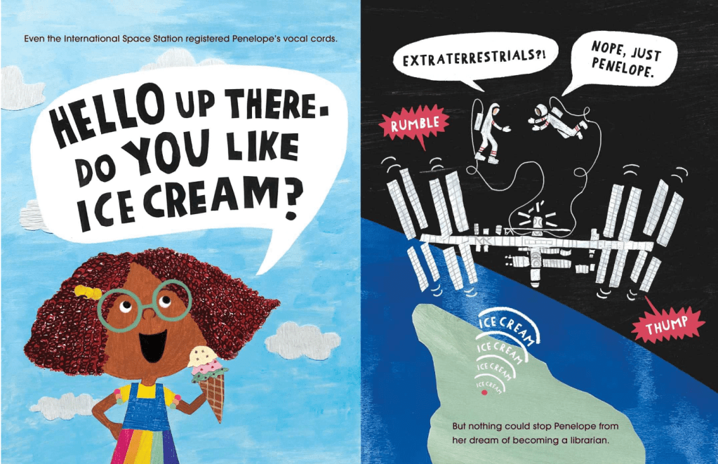 JENNA: I was brainstorming ideas one day and the thought occurred to me that it could be funny if a very loud student (so loud she could be heard in space!) was picked to be the student-librarian. The rest of the plot was developed over many, many revisions. I needed to let the character, Penelope, lead the way on where the story arc would go!