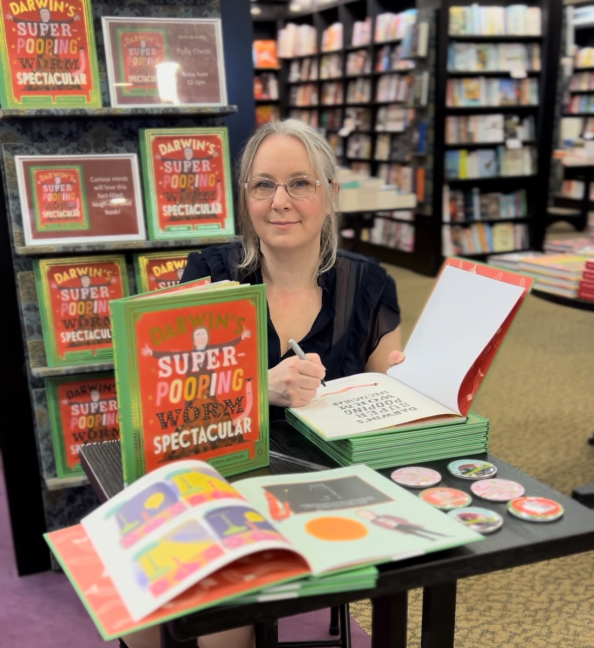 POLLY: Well, it’s early days and I’m still learning. I’ve written a few blogs, including for the Earthworm Society. I’ve done three bookshop signings where my daughter made a worm costume and gave out badges and bookmarks!