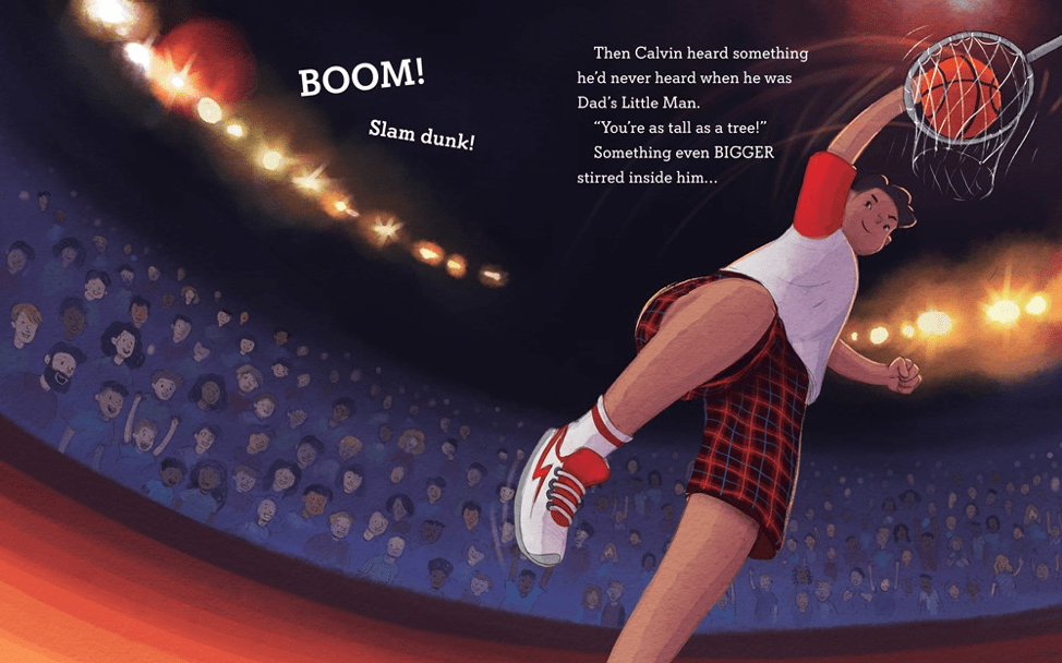 I did include a few art notes but only to make clear what was happening. In this illustration, which I love, the art note said: [Calvin transforms into a tall basketball player who is slam dunking in front of fans.] There is so much to love about the spread! In the previous pages the art is softer and lighter in color. Then on this page turn there is a dramatic shift to moody, darker colors. Calvin is drawn to still resemble himself as a little boy, while at the same time indicating an older, bigger version of himself. I love the smirk on his face! In later pages his facial expression also changes to fit the tone of the story. The art is so amazing!
