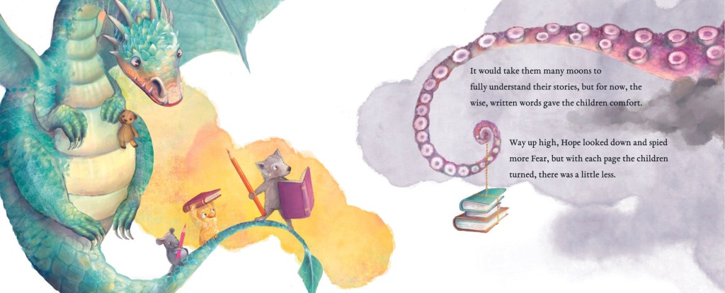 Synopsis: Far above the world, Hope the dragon somersaults through the sky, protecting those below.  But he encounters a formidable opponent in Fear.  Fear proves no match for Hope, until he meets a curious character, The Reader.  And it’s inside The Reader’s vast library that Hope finds what he’s looking for, plus much more…