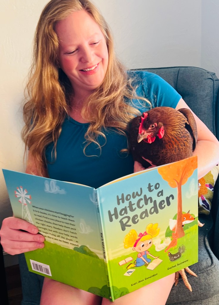 KARI ANN: Ideas are all around us! This story was inspired by my two emerging readers. As I looked for creative ways to help my daughters learn to read in the pandemic, we began taking our books outside for a bit of fresh air. Amazingly, our six chickens always flocked to be near the action of my daughters reading aloud and often perched in their laps listening to the stories and looking at the pages. I could swear every time our chickens bokked, they were begging for more โBBB-book, booksโ.