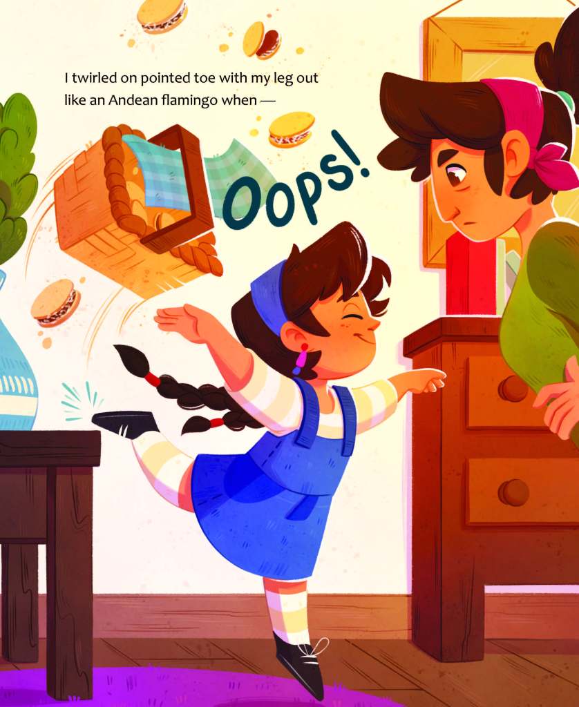 I twirled on pointed toe with my leg out like an Andean flamingo and—oops! [Illo. Note: kicks basket off table]