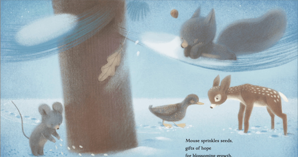 I only included one art note. Most of the gifts the animals bring are fairly concrete – like acorns for food, or feathers for a warm bed. But I wanted to make sure readers would understand Mouse’s seeds were meant as a wish for young creatures to blossom and grow.