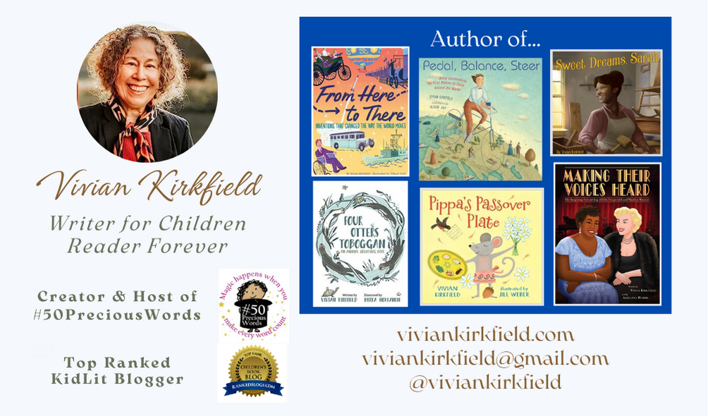 ⭐️ Picture Book Manuscript Critique (Rhyming or Non-rhyming, Fiction or Nonfiction) with written feedback AND a 30-minute Zoom Chat with children’s author Vivian Kirkfield, author of the brand new, about-to-be-released PEDAL, BALANCE, STEER: Annie Londonderry, The First Woman To Cycle Around The World (Calkins Creek, February 20, 2024), PIPPA’S PASSOVER PLATE (Holiday House, 2019), SWEET DREAMS, SARAH (Creston Books, 2019), FOUR OTTERS TOBOGGAN (Pomegranate, 2019), MAKING THEIR VOICES HEARD: THE INSPIRING FRIENDSHIP OF ELLA FITZGERALD AND MARILYN MONROE (Little Bee Books, 2020), FROM HERE TO THERE: INVENTIONS THAT CHANGED THE WAY THE WORLD MOVES (Clarion Books, 2021), and SHOW ME HOW! BUILD YOUR CHILD’S SELF-ESTEEM THROUGH READING, CRAFTING AND COOKING (MoneyPenny Press Ltd, 2010)