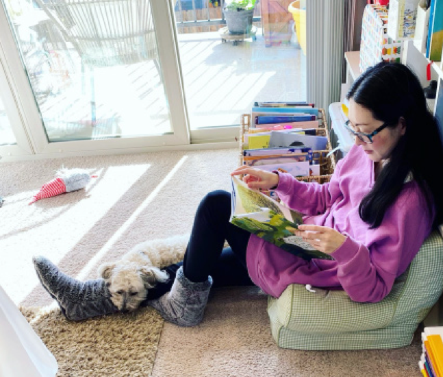 Sharon’s rescue dog, Mowgli, especially loves it when her work day involves a blissful morning reading picture books.