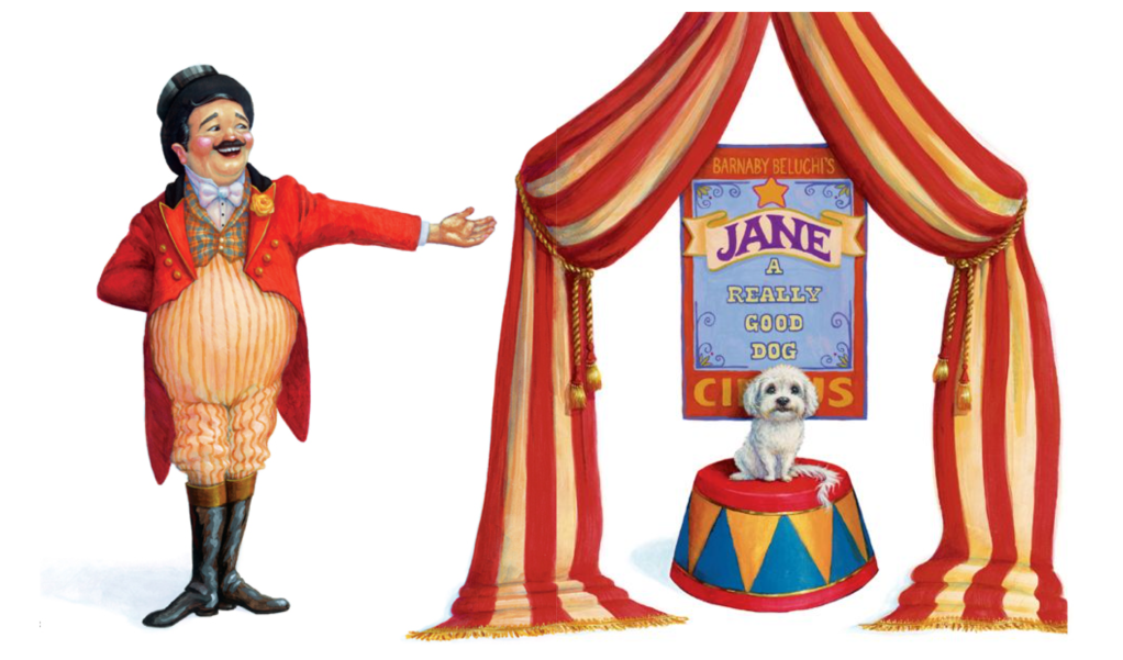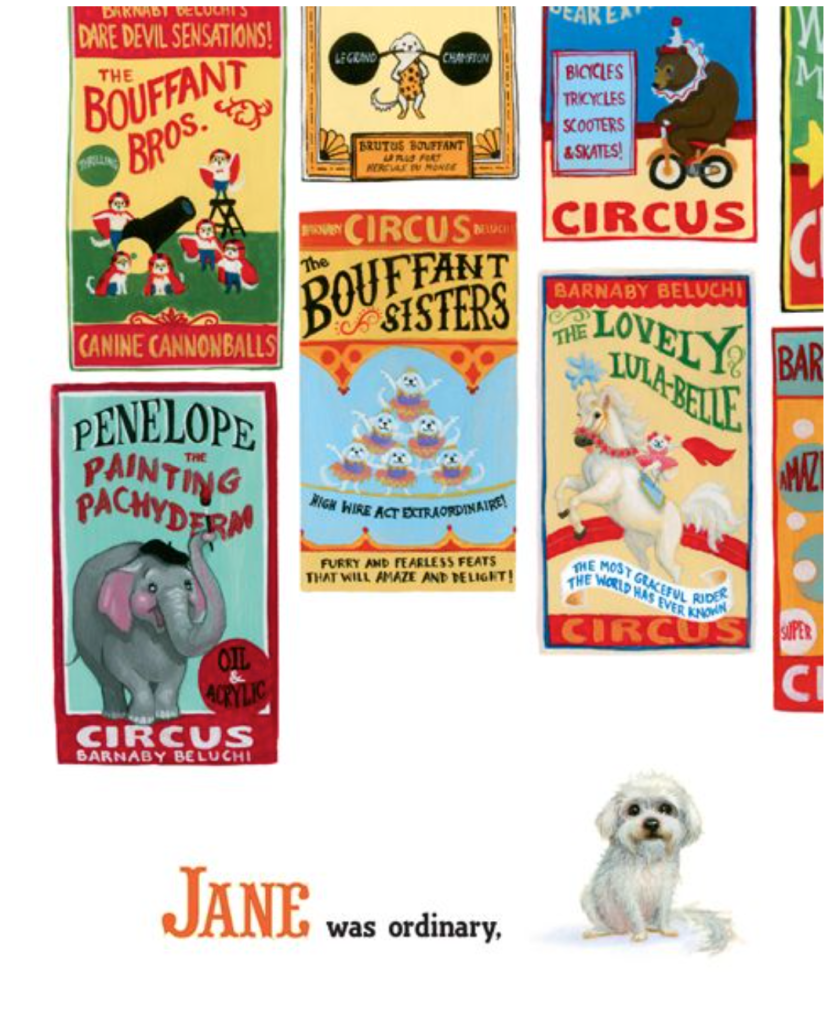 Brief Synopsis: Jane is a little dog who lives at the circus.  She’s not graceful like her mother, mighty like her father, daring like her brothers, or fearless like her sisters.  She’s just Jane.  But you don’t have to be graceful or mighty or daring or fearless to be special.