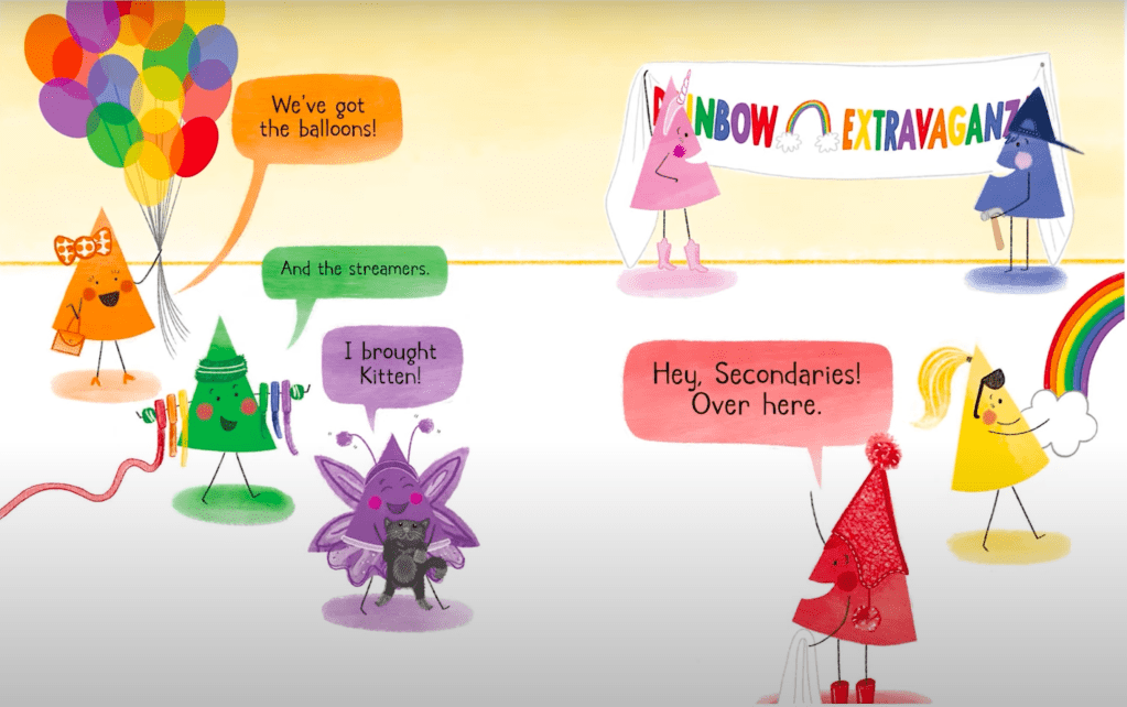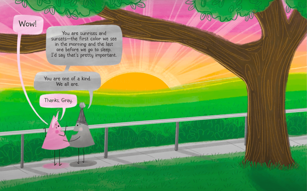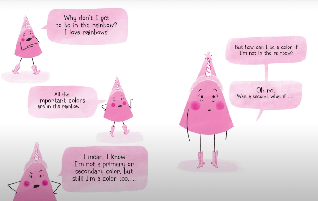 Brief Synopsis: [from the publisher] “Pink loves her rosy world, from her pink toy dinosaur to her pet flamingo, Phil. But when she sees the Primaries and Secondaries getting ready for the Rainbow Extravaganza, she begins to wonder why she isn’t in the rainbow…and if that means she’s not really a color. Then she meets the Tints, and she’s even more confused. Luckily, a friend shows her the many ways she spreads joy―reminding Pink that she is truly one of a kind, rainbow or not.”