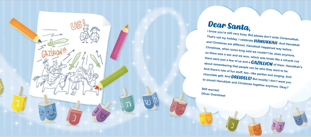 OY, SANTA!, or There’s a Latke to Learn about Hanukkah, is the story of a Jewish child who wants to get the message across that Hanukkah and Christmas are not related. AT ALL! Told through a series of email exchanges, OY, SANTA! unfolds as an uncompromising expression of Jewish pride as young Oliver Overstreet confronts one misconception after another about Jewish holidays. And while Ollie and Santa eventually come to respect and appreciate each other’s traditions, OY, SANTA! is a response to the oft-held notion that Jewish children are less-than or somehow deprived during the holiday season. With a strong SEL component–poor Ollie really needs to develop PATIENCE!–the book is also a kid-friendly approach to religious diversity and honoring differences.