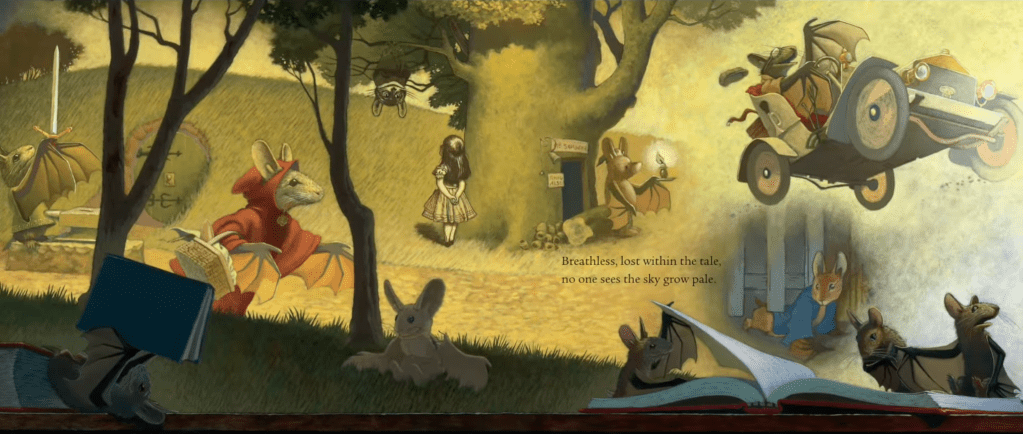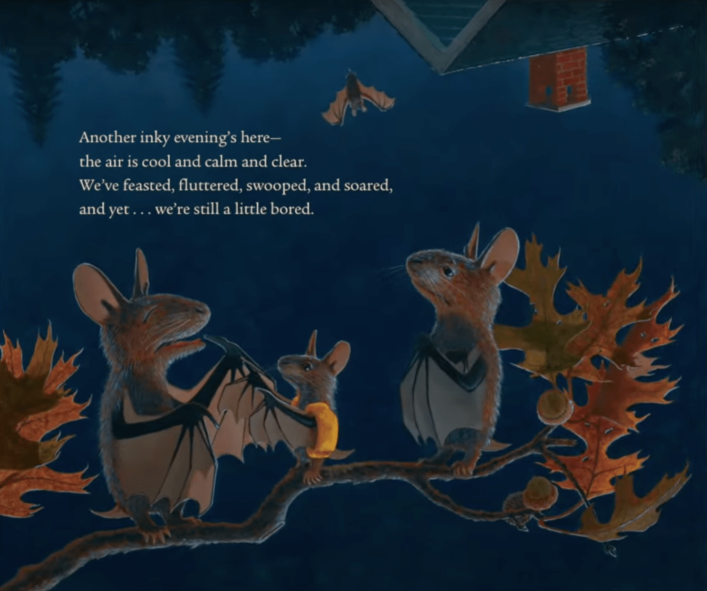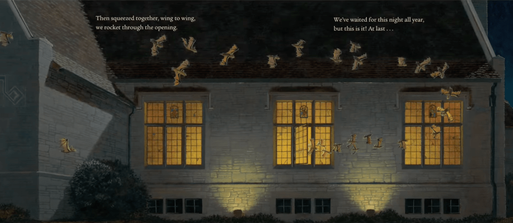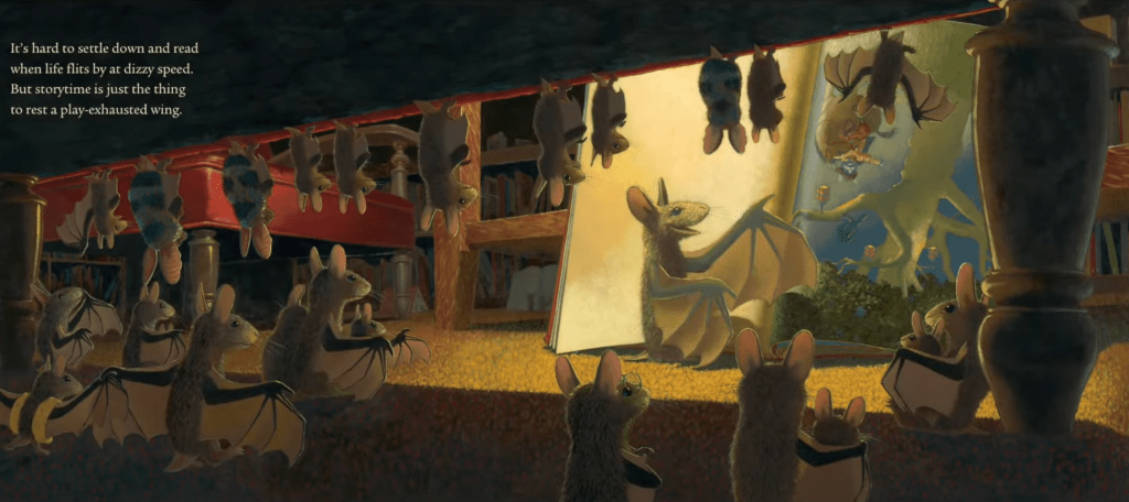 Brief Synopsis: On a dark evening, someone leaves a window open and suddenly it’s bat night at the library. What a treat! The bats explore all the library has to offer and get lost in the joy of stories, but all too soon dawn draws near and it’s time to go home and hope it won’t be long before a window is left open again.
