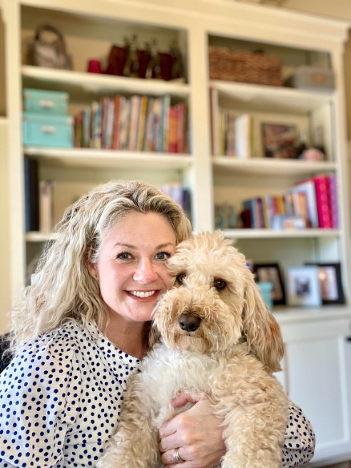 Author Kelly Conroy in her office with her writing partner, Chewy 😊 Kelly says, “I don’t snack much, but my crutch is naps. I find a lot of inspiration as I’m falling asleep. I’m serious.”