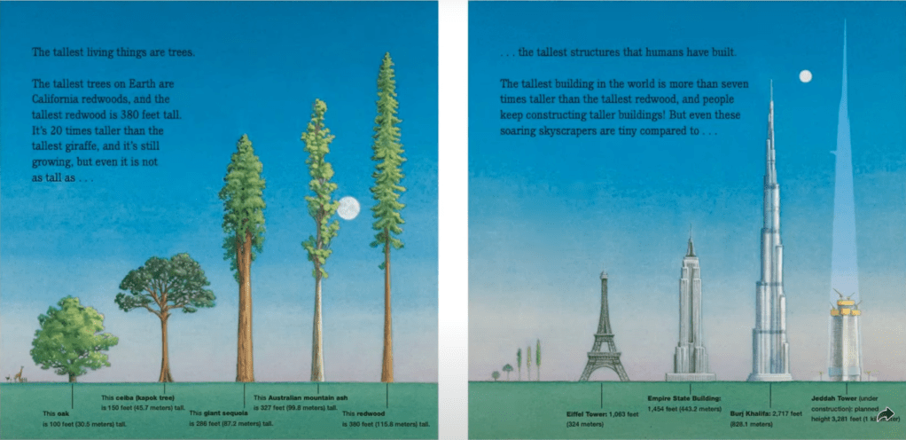 Absolutely fascinating way to talk about comparative heights and introduce the universe! Looks like the illustrator had fun – every page pops!