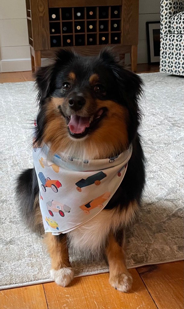 Elizabeth’s friend’s dog ,Möbi, modeling her limited-edition bandannas printed with Anna Aronson’s fabulous endpaper designs (for giveaway).