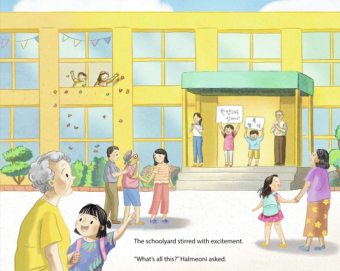 “What’s all this?” Halmeoni asked. [Illustration note: Families arriving at the school together]