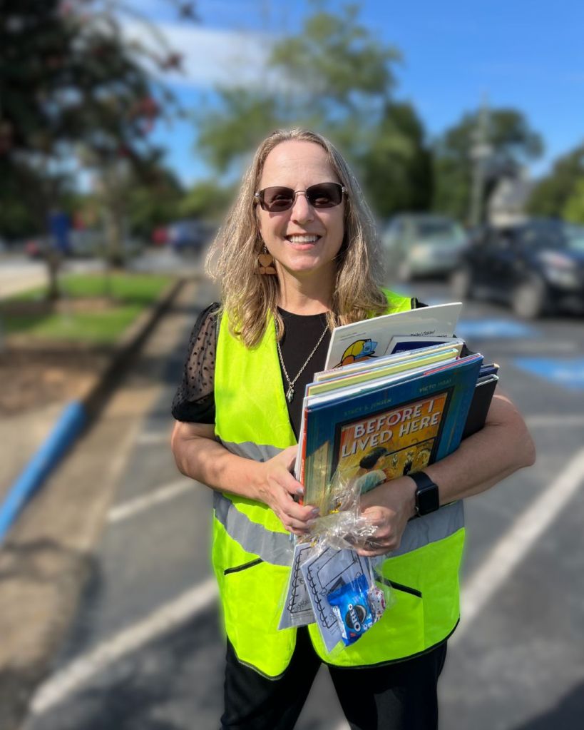 This is me at the food pantry line with books (including Before I Lived Here) and the treats we gave to the children.