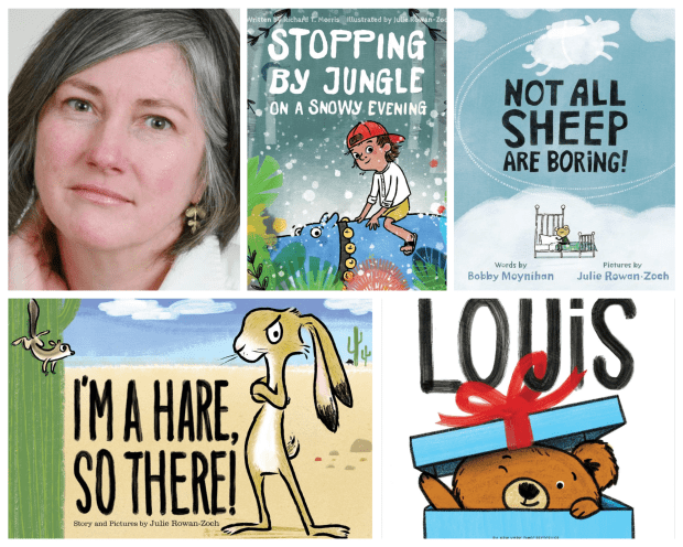 Julie is a reformed graphic designer, concocting and sculpting story ideas and illustrations – every day.  She is the author and illustrator of I’m A Hare, So There!, and the illustrator of Stopping By Jungle on a Snowy Evening, Not All Sheep Are Boring, and Louis.