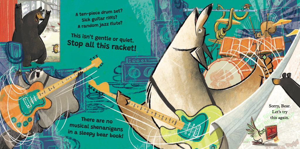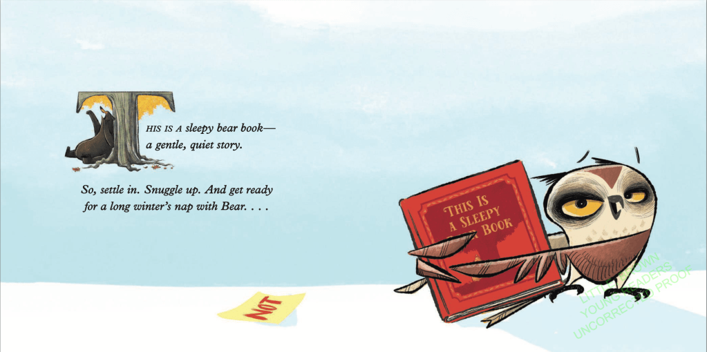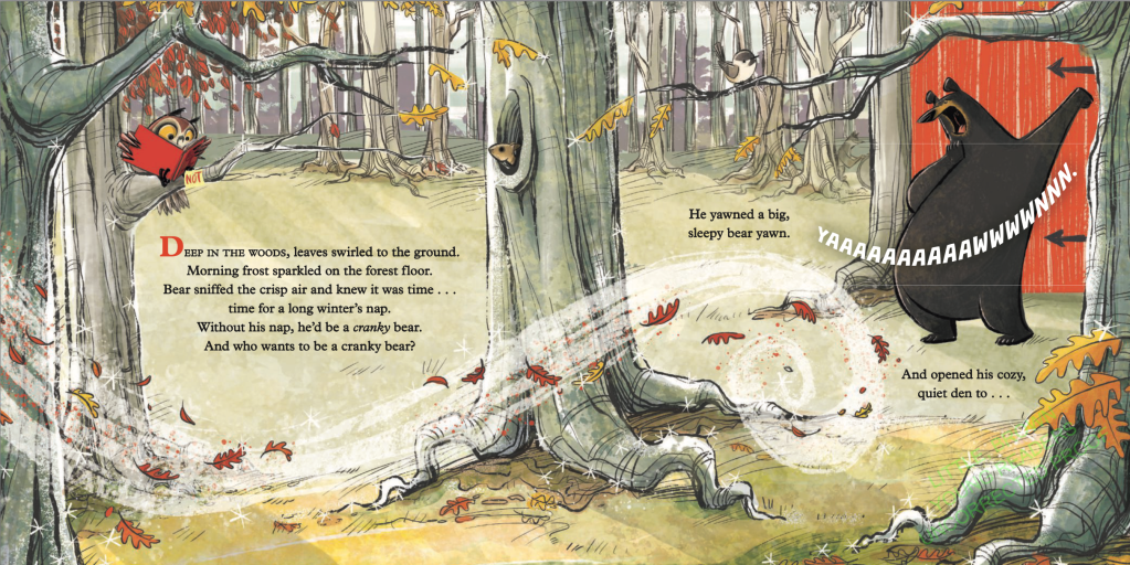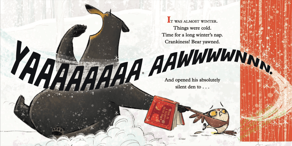 Why I Like This Book: I don’t just like this book. I LOVE it! Sooo funny! It starts with lovely. lyrical text about the morning frost and the crisp air and sets the reader up for the classic quiet bedtime/hibernation story, but with the very first page turn, things begin to go awry. Owl, who is in charge, does his best to turn the ship around by starting over with some new lovely, quiet lyrical text – geese overhead flying south, wind whispering of winter, etc. – and Bear tries again to retire to his “very quiet den”, but alas, more shenanigans! Everyone knows that when folks who need sleep don’t get it, they become cranky. And no one wants a cranky bear, do they? Owl is firm. Bear has to go to sleep. But all this messing about is taking too much time. They need to speed the story up. So the quiet soothing lyrical parts become increasingly short and abrupt, while the shenanigans continue unabated.