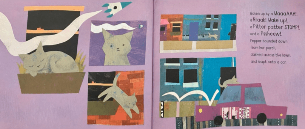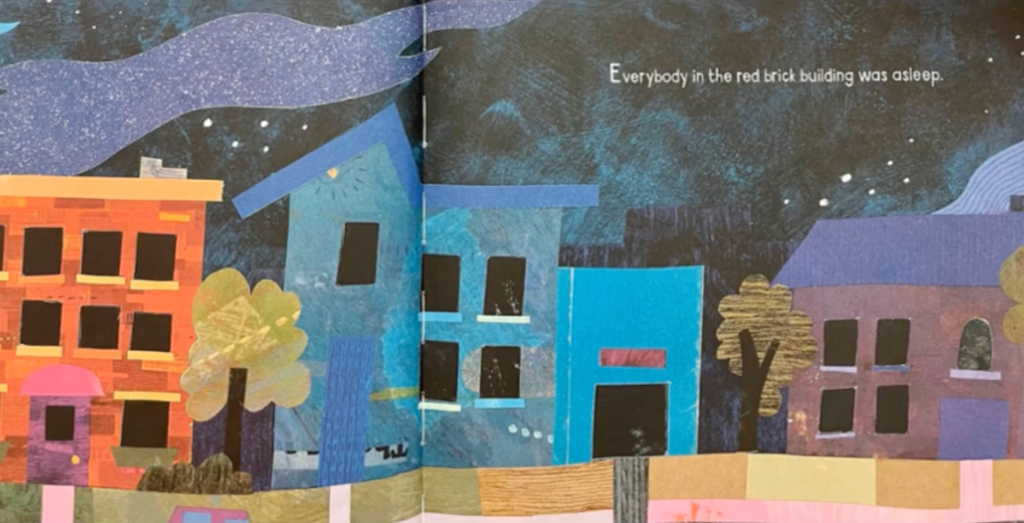 Why I Like This Book: First, it’s hard to decide what to love more – the text or the art! I have to call it a tie! The art reminds me of The Snowy Day. The colors are so beautiful, and the collage style provides so much visual interest. I especially love the cat 😊. The story takes place in an urban setting. It’s a bedtime story about being woken by noises in the middle of the night and then trying to settle down and get back to sleep. It is full of onomatopoeia which makes it very fun to read aloud, and it’s a cumulative tale so it really allows the reader to experience the escalation of sound. Then, at the climactic noisy moment, it turns around and takes readers back down from all the disruptive, middle-of-the-night noise, through one soothing, quiet, calming sound at a time until everyone is asleep again. The ending is so sweet that I have to tell you about it, so, SPOILER ALERT STOP READING IF YOU DON’T WANT TO KNOW THE ENDING! The last soft sound, the one that puts the baby back to sleep, is the sound of her mother’s heart beat. 🥰 Parents and grandparents, I see you tearing up 😊