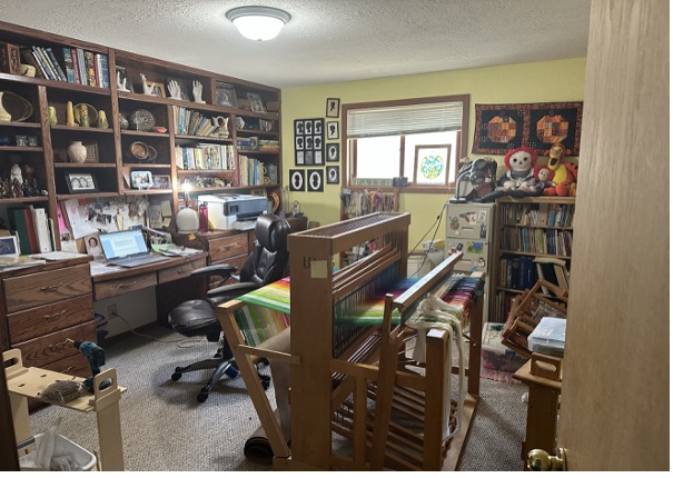This is my workspace – office/weaving room. My husband built these beautiful book shelves just for me. I don’t know if writing interferes with weaving or vice versa but I enjoy doing both.