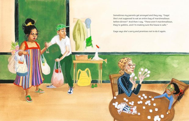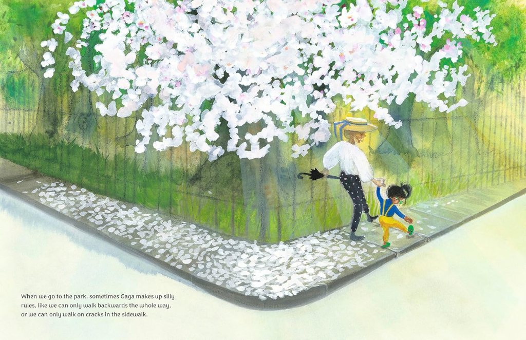 Brief Synopsis: [from the publisher] “Gaga days are the best! That’s when this eccentric, mischievous grandma babysits her delighted granddaughter. These Gaga days are always full of the silliest “mistakes,” like swapping eyeglasses and walking backwards to the park. Like making the house safe by eating all the marshmallow goblins, filling the tub to bursting with bubbles, and then reading a bedtime story all the way through upside down.”