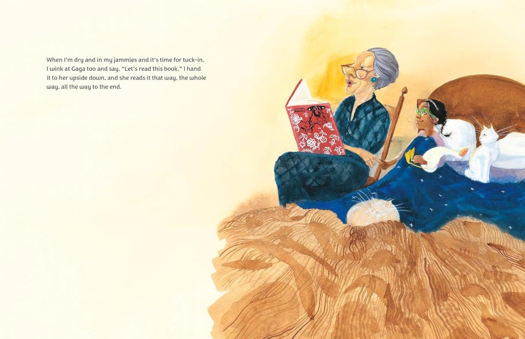 Why I Like This Book: There is something special about grandparents. Kids get to do things with them they might not do with their parents. The relationship is different – a little more carefree; a little less pressures and routines of daily life and a little more relaxed and fun. And that is certainly the case with the little girl and her Gaga in this story. Their pure delight in each other’s company, the sheer enjoyment they find in spending time together just leaps off the pages of this happy, silly book. Gaga calls the cats comically incorrect names – instead of Rainbow and Honeybutter, she calls them (among other things) Riverbottom and Honeycrisp. She and her granddaughter play games, go to the park, have a very eclectic lunch, dress up, dance, and bake cupcakes with sprinkles to have a birthday party for one of the stuffed animals. Gaga lets her granddaughter eat a whole bag of marshmallows before dinner, and floods the bathroom with bubbles during bath time. Oops. 😊 And at the end of their fun-filled day, the granddaughter shows that she is truly Gaga’s granddaughter, has picking up on Gaga’s humor by handing her the bedtime story to read upside down… which Gaga does, the whole way through as though she hadn’t noticed. Such a delight, this book! A perfect read for any child with a beloved grandparent!