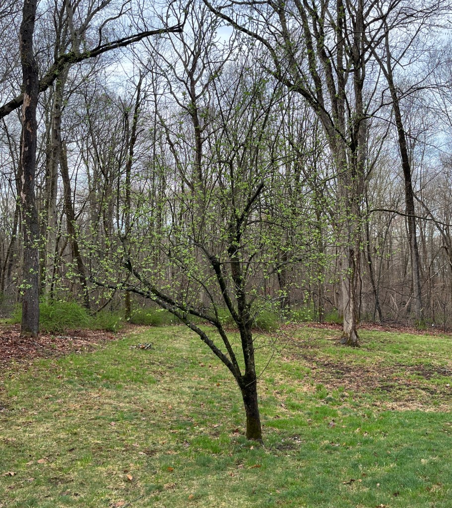 Early yesterday morning, when I took the dogs out, I noticed that overnight (in the middle of a heavy rainstorm no less) my little apple tree had suddenly gone from bare to misted with brand new leaves. How amazing that such a thing can happen overnight – or at least appear to. It’s like magic!