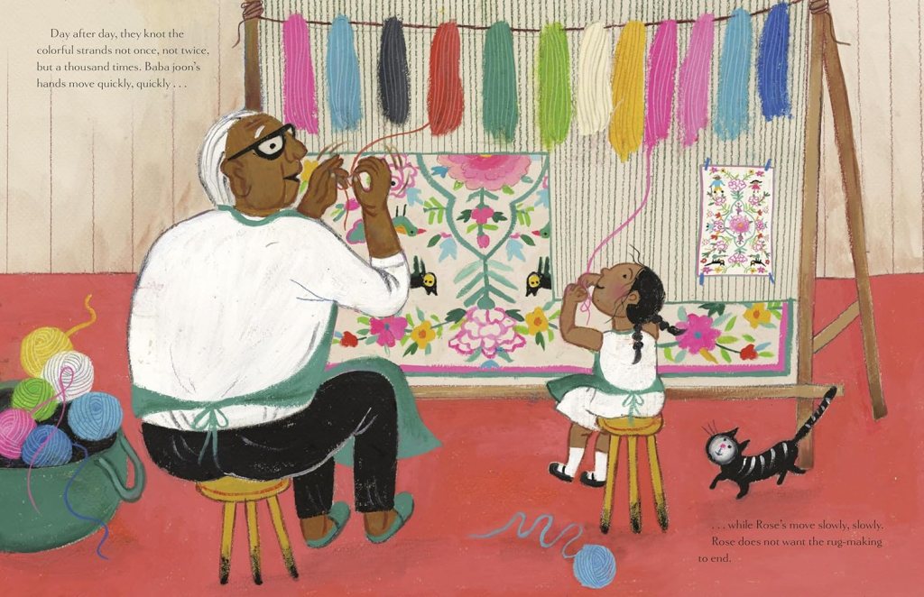 When Rose decides she wants to weave her own rug — its design inspired by a drawing she made of their garden–Baba is thrilled to teach her. Working side-by-side at the loom, grandfather and granddaughter tie colorful strands of yarn into thousands of knots. But just as the rug slowly begins to take shape, Baba falls ill.