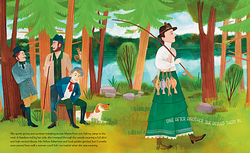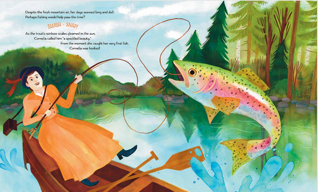 CATHY: I sifted through the key events in Cornelia’s story to find significant highlights that would come to life when illustrated. I knew her passion for the woods, waters and wilderness would make a perfect backdrop for colorful scenes to engage readers.