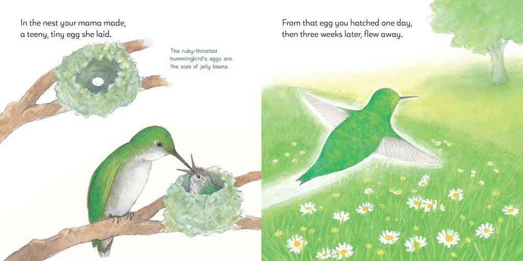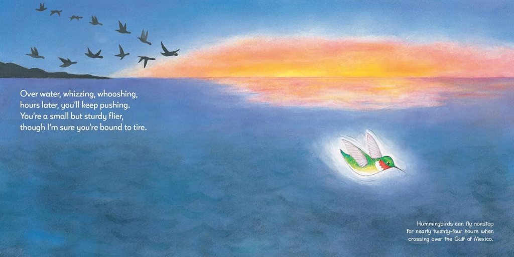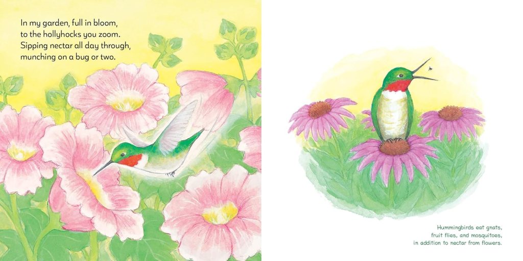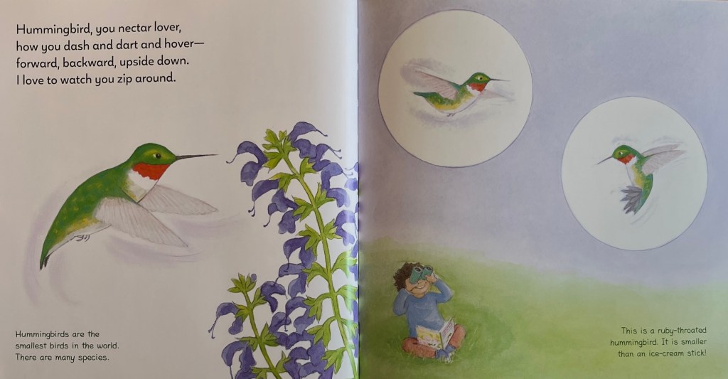 Links To Resources: the book is filled with little informational tidbits, and has back matter with a note from the author about the inspiration for the book and recommended websites for curious readers to investigate; hang up a hummingbird feeder where you live and see who comes to visit!
