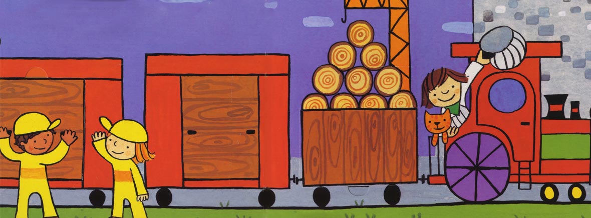 The title says it all. This is one of Hill and Larranaga’s series of sculpted-edged, transportation-themed board books. It takes its ninety-seven freight cars full of animals, toys, fruit, and lumber safely from an eastern railroad yard cross-country to its final western destination. Along its route, the engine must stop for a crossing gate and barely avoids a head-on crash when Switchman Jack almost forgets to switch tracks for a passenger train, but all is well that ends well. The flaps are absolutely basic paper engineering, but manage to hide a few surprises, while the softly rounded forms of Larranaga’s politically-correct mixture of little people are comforting. Meanwhile, Hill’s rhymed text chugs the train forward. Alas, the red caboose no longer exists in modern railroading, so for that old homey feeling toddlers will have to make do with the girl engineer’s ginger cat.