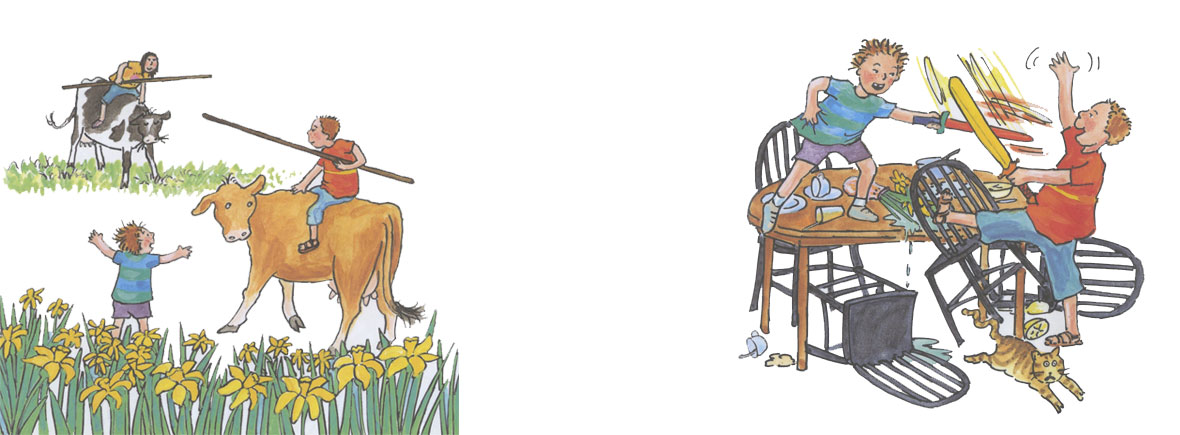 Arthur and Lance love to play with their swords in the house. But Mom, even when conveniently distracted by the upcoming garden club show, is adamantly opposed to the activity. When she leaves the boys for the day, they find other things to do, like jousting atop cows in their mother’s prize daffodil beds. Snappy family conversation, complete with sarcastic witticisms, may fly right over the head of the intended audience for this reader, but it will ring true for the adult sitting and helping sound out words. Sunny ink-and-acrylic illustrations keep the story as light and humorous as the situations the boys get themselves into. And, in the end, when they replace their swords and lances with manure shovels, readers will smile with understanding. Three quick-paced chapters for the reader just on the verge of real chapter books make this a quick and amusing read. And that’s just the point. (Easy reader. 4-7)