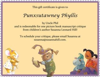 Susanna Leonard Hill – PB $75 (You can email, snail mail, or wrap and present this beautiful personalized gift certificate! – which you can see larger if you click the critique link)