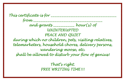 Every writer appreciates uninterrupted time to write, so give this certificate, rolled in a scroll and tied with a bow to the writer on your list. Take the kids to the zoo, or the dogs for a walk, or yourself to the movies, and leave your writer with a couple of blissful hours of peace and quiet to pour those words onto the page!