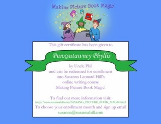 Making Picture Book Magic Online Writing Course (Susanna Leonard Hill) ($99) (You can email, snail mail, or wrap and present this beautiful personalized gift certificate! – which you can see larger if you click the link for the course)