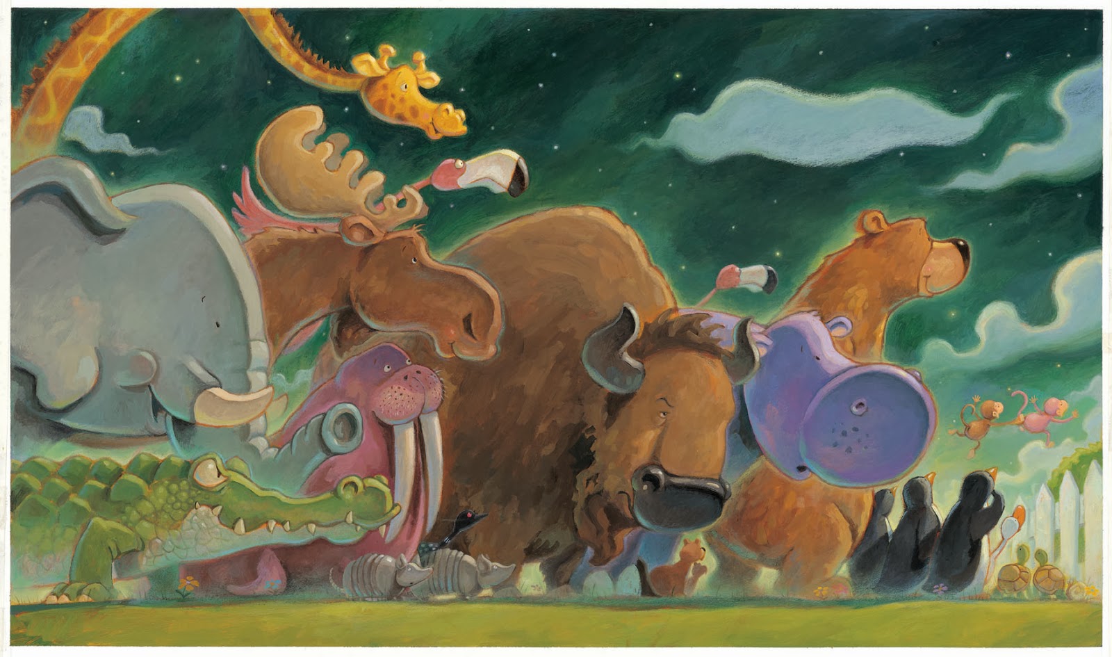 My Skype presentations are the same as my in-person visits. I start off with a short intro, telling a little bit about me- how I was born in Poland and came to the U.S. when I was seven and went right into first grade not speaking any English, and then how my dream of making books for children came true. Then I sing/read one of my nursery rhyme books, and I’ll have the kids sing at least the first verse along with me. Then I will discuss the bookmaking process, talk a bit about getting ideas and turning them into stories, and then the many revisions that are needed. I will show samples of my storyboards, dummy sketches, color studies and final art. I will also show some of my rejected works- paintings I had started but wasn’t happy with. And I have some press sheets to show them so they can understand the printing process. After that I will do Q+A then go on to a drawing demonstration. I’ll choose a character from one of my books and have the kids think of some ideas of what the character could be doing and I will draw it for them. Then I’ll ask the kids to help me add details to the drawing and I will put them in. A typical scene might be a bear riding on a skateboard and juggling. For details they will ask me to put in the sun, birds, bunnies, flowers, ladybugs, etc. I love that! There are so many edgy books out there and it’s reassuring to me to know that kids are still charmed by the beauty and wonder of nature.