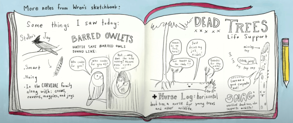 Links To Resources: The whole book is a resource – Wren’s notes throughout, and several pages at the end of the story devoted only to her notes and pictures – so there are a lot of resources to be found right there. Take a nature walk. Make your own nature notebook/sketchbook and write and draw the things you see. Go for a hike with your family. How To Make A Nature Journal/Notebook; Video: How To Make A Leaf Collage
