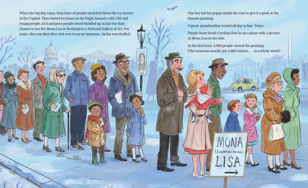 I asked Debbie what inspired her to write JACKIE AND THE MONA LISA, and she responded: “Growing up, art was always my favorite class. I teach second grade now (which I love) but had also dreamed about becoming an art teacher. This, combined with my love of history and museums, and my admiration of Jackie Kennedy, came together to inspire me to write Jackie and the Mona Lisa. Another reason for writing this particular story is my love for all of the “little known stories” in history or incredibly interesting stories that have been lost in time that I believe kids (and adults) would love to know. When I hear someone say that history is boring… I just think that they haven’t heard all of the interesting stories and anecdotes that correspond with all of the names, dates, and people we are taught to remember. I hope that this book can inspire children to go to museums and learn about the arts.”