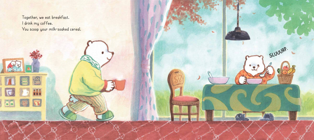 Why I Like This Book: This book lovingly shows how a mom at work does her job and simultaneously has her child in mind all day long. Though they may be apart, she is always thinking of her little one. The story flows seamlessly between what the mother is doing and thinking and what the child is doing, showing their parallel activities. As the mom reads her emails, she thinks about reading with her child, and on the page turn, her child is in school reading a story. As the mother eats lunch with a friend, she thinks about eating with her child, and on the page turn the child is eating lunch with school friends. This sweet story will reassure any child that whether mom and dad go out to work or work from home, any time they’re separated during the day they are always in their parents minds and hearts. The soft watercolor art captures the tender mood of the story perfectly. A wonderful choice for any bookshelf!