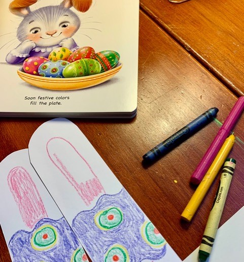Inspired by Ela Jarzabek’s whimsical Easter egg patterns in BUNNY FINDS EASTER, here’s a colorful version of bunny ears for little ones to make and wear after they read the book so they can go on an Easter hunt just like Bunny does in the book.